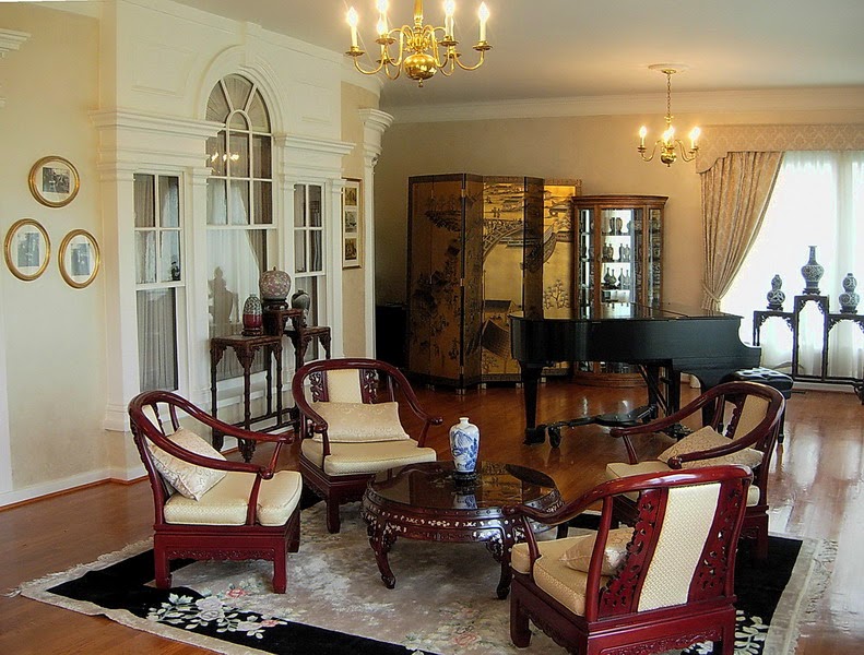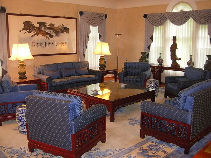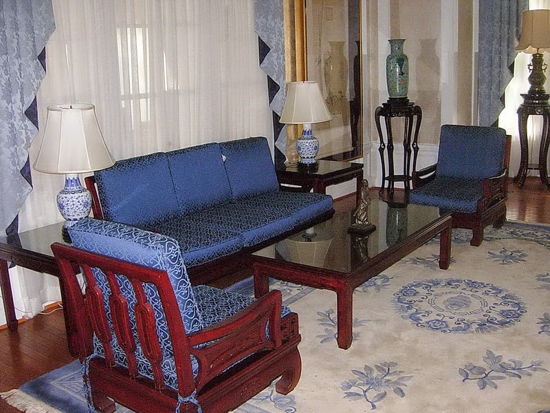↑小藍廳是接待來訪貴賓之所,主客就位,促膝長談。家具多為紫檀木製,沙發、座墊、地毯、窗簾等均有精緻的花紋,牆上畫作出自名家。