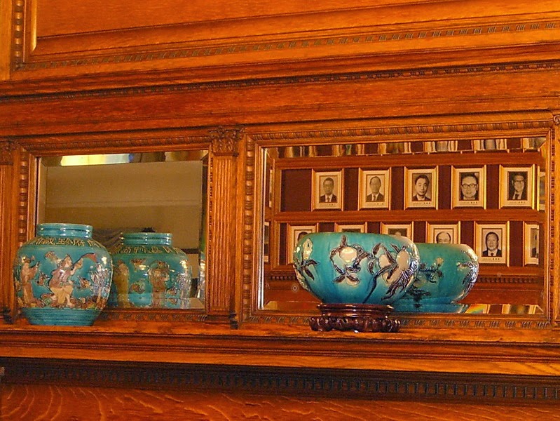 ↑左牆掛了好幾張首任屋主赫伯德與雙橡園的老照片。平台鋼琴後方的屏風仿〈清明上河圖〉。