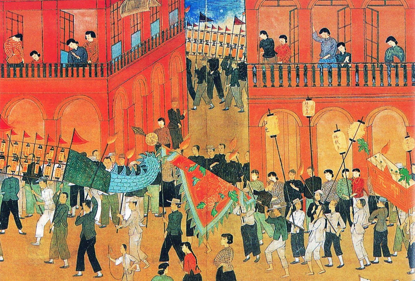 讓我們再舉郭雪湖的作品為例吧!1930 年入選第四屆臺展的《南街殷賑》,便以濃厚的漢人生活風情吸引了眾人的目光。畫面中描繪的是中元普渡前,臺灣民眾至大稻埕南街採買的生活場景。畫家將高聳的洋房、林立的店家招牌、衣著傳統漢服的行人與車水馬龍的人潮,櫛比鱗次地安排進畫面中,營造出豐富且熱鬧的氛圍。看看畫裡右下角的大稻埕信仰中心──霞海城隍廟,又有「慶讚中元」的大旗橫掛上頭,好不熱鬧!