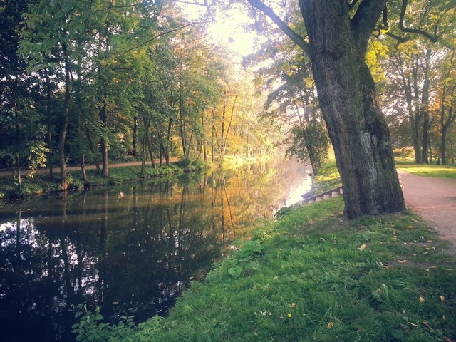 當時我還在德國留學,我萬萬沒想到在我宿舍附近竟然有這種地方──整個空間裡花團錦簇,夕陽穿透密蔭的樹葉,在柔軟的落葉地毯上落下一塊塊光區。平整的草地旁小溪潺潺,河畔上的楊柳幾乎要垂到水面,一直延伸到樹林中央的一座如鏡的小湖。