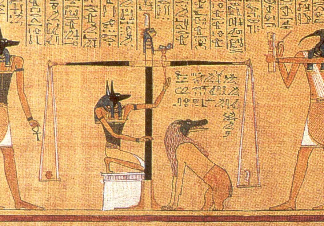 埃及宗教文獻《死者之書》其中最有名的章節是在歐西里斯面前進行的最後審判,將死者的心臟放置在天秤一端,若是心臟比另一端象徵的真理與秩序的羽毛重,表示此人生前行事不端,就會被在一旁虎視眈眈、擁有鱷魚頭,獅子上身及河馬下身的猛獸阿米特(不是阿密特喔!)吞噬,也就無法進入極樂世界(Duat),開啟死後人生。而執行、監看這項重要工作的也是阿努比斯。