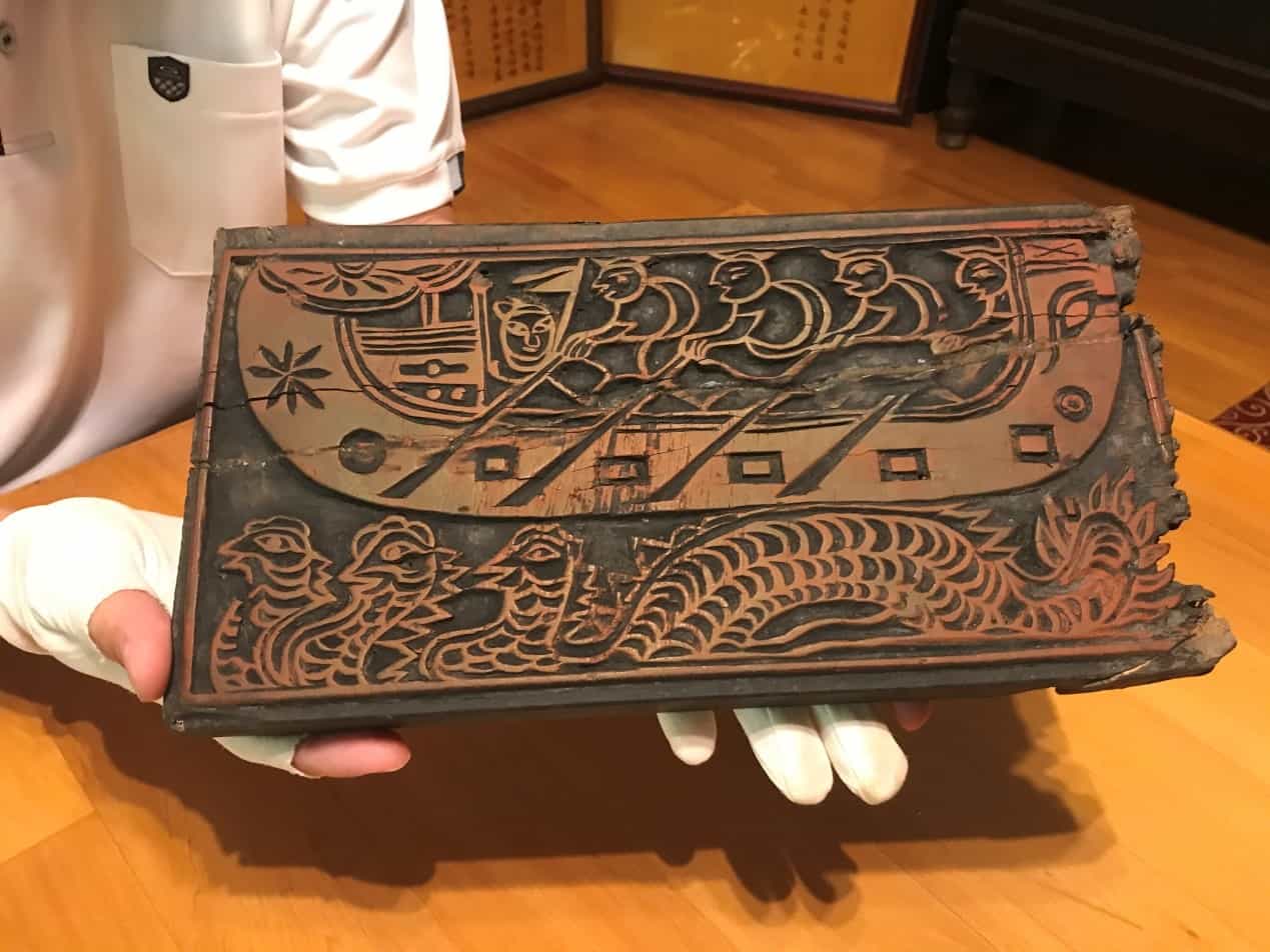 有一天,許燦煌在峴港附近,看見路旁一位婦人正在切餵豬吃的菜,他火眼金睛,目光很快掃到婦人那塊砧板,他向婦人借了砧板,一翻,背後竟是一幅有船有龍的木刻作品。他當下判斷,船身屬八槳樣式,應該是 4、5 百年前的明代工法,於是另外買了一個全新的砧板送給婦人,以換取舊的那塊。