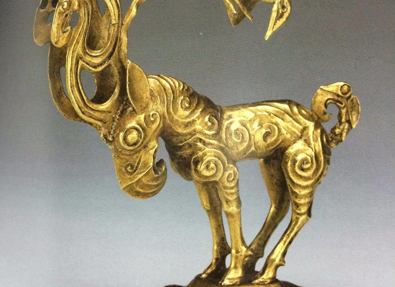 這次我們要找的是什麼樣的怪獸呢?首先讓我們來好好認識一下它。這隻金怪獸有著鹿的身形、纖細的長腿和四個腳趾,讓我們可以清楚確定它是隻鹿。此外,它有一對豎立的大耳朵、大大的眼睛,以及一副巨大華麗的大角,身上還裝飾著漩渦和流雲一樣的捲雲紋。最後,站在一個方型的小小台座上,台座四邊有著打了小洞的葉片,應該是可以縫在其它東西上面。