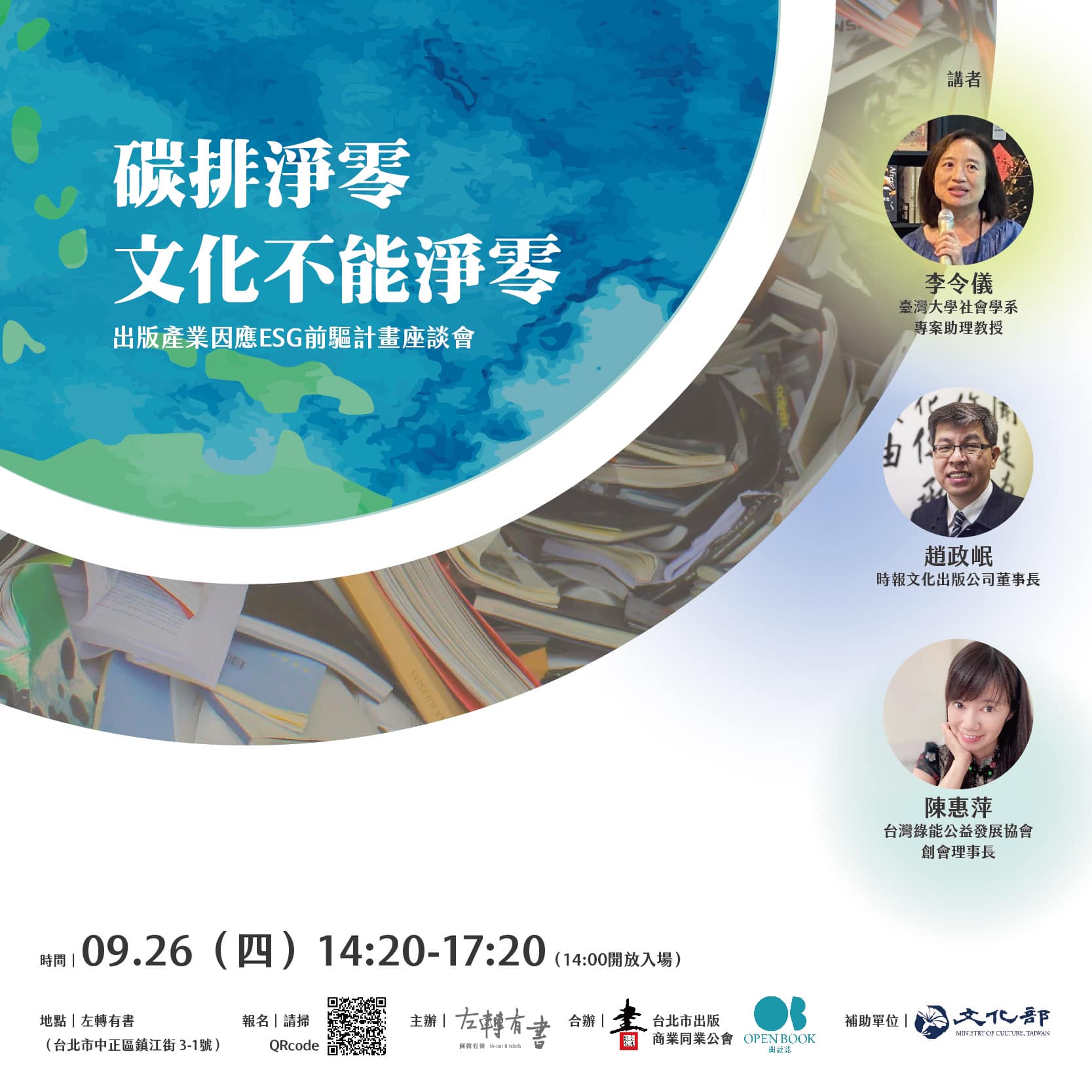 書本不只是知識的載體,也可能是對氣候行動的回應者。獲得文化部「文化產業淨零轉型」補助支持,書店「左轉有書」啟動了「碳排淨零,文化不能淨零」計畫,從閱讀出發,延伸到對出版生態的反思與實踐。透過問卷、座談及焦點討論等方式,試圖搭起出版業與永續之間的對話橋樑,並從實務中探索文化產業的行動方向。這是一場結合思辨與實作的經驗分享,也是一個讓閱讀連結世界、回應時代的過程。