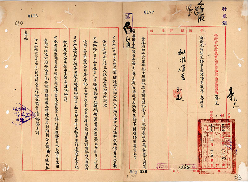 戰爭結束後,我國政府派員接收茶葉傳習所,更名為「臺灣省行政長官公署農林處茶葉傳習所」,儘速恢復茶園面貌,聘請講師講授茶葉種植技術(圖 4)。後來,二二八事件波及林口,茶葉傳習所部分物資遭竊(圖 5),經調查處理後恢復作業,並向臺灣省政府申請資金投注茶葉技術的研發(圖 6)。1950 年,配合農林處改組為農林廳,易名為「臺灣省農林廳茶葉傳習所」,與此同時政府將林口劃為全省示範茶區,成立指導委員會,設置示範茶園,配合茶葉傳習所講習課程,提供全國各地學習仿效,不斷創新茶葉產製技術。1968 年,政府在桃園楊梅設置臺灣省茶葉改良場,茶葉傳習所改置為茶葉改良場林口分場,持續推廣茶葉種植。至1970 年代初期,林口茶葉產能達到巔峰,茶樹種植面積甚廣,然而國際市場競爭激烈,臺灣茶葉價格持續低落,茶農生產不敷成本,影響種植意願甚鉅。
