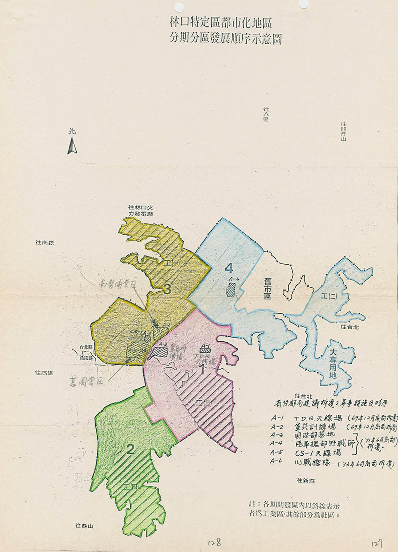 我國擘劃十大建設之際,也面臨都市化發展快速、人口過於稠密的問題,必須設法解決。政府於 1970 年底核定林口特定區都市計畫,涵蓋林口、五股、泰山、八里,以及桃園、蘆竹、龜山等地,以 25 年分 5 期計畫打造北部商業都市,容納臺北盆地增加的人口以減緩壓力,同時兼具疏導臺北洪水惡性發展,以及全面發揮土地利用價值的目的。為落實該項計畫,規劃以高速公路為核心,建置新都市發展中心,並設置工業區與住宅區,使工業發展與住宅興建以及其他土地利用納為整體發展。林口特定區地域遼闊,開發規模浩大,先後面臨土地徵收困難(圖 14、圖 15)及土地發展限制令等爭議,經過檢討後陸續變更計畫,讓開發計畫得以施行。