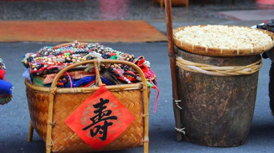 湊近看,籃子裡面的首飾花花綠綠,有的還有貝殼、山豬牙。有些衣服因為太舊而失去了本來的顏色,但是仔細看仍然能看到人工織布、手工刺繡的紋理。反觀現代的衣服雖然顏色鮮豔,但是一看就知道是電繡,不知道一百年後還能不能像他的前輩一樣保存得這麼好。