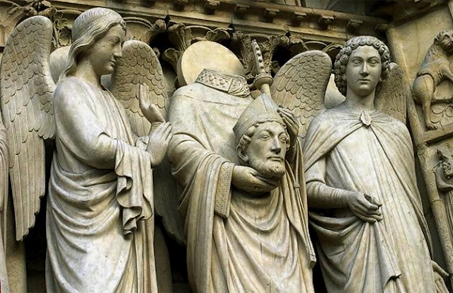 聖丹尼斯是西元三世紀的巴黎主教,當時的羅馬帝國還在迫害基督徒,所以當聖丹尼斯被抓到後,便被羅馬總督斬首了。不過,恐怖的事卻在這時候發生了!據說聖丹尼斯在被砍頭之後竟然站起來、撿起他被砍下的頭、還一邊講道一邊走了 10 公里左右!後來,他變成頭痛的治療聖人(真合理)。