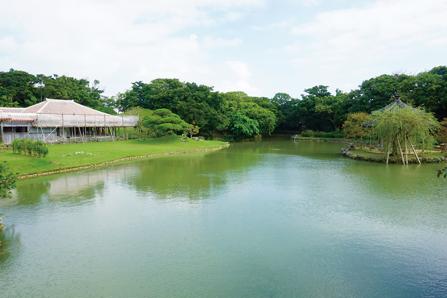 從六角堂看回池的一端,會清楚見到識名園的御殿。