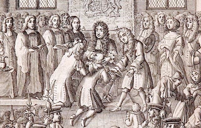 查理二世特別堅持要延續這項傳統,因為這種治療儀式凸顯出他貴為國王的地位。他在觸碰病患的患部時,周圍也開放讓民眾圍觀。患者站在兩根橫木之間,在國王面前排成一列。他們雙膝跪地前進,國王伸手觸摸他們雙頰時,神職人員會在一旁唸著:「藉由國王的撫觸,上帝將您治癒。」觸摸完畢後,每位患者會領到一條掛了金牌的緞帶。