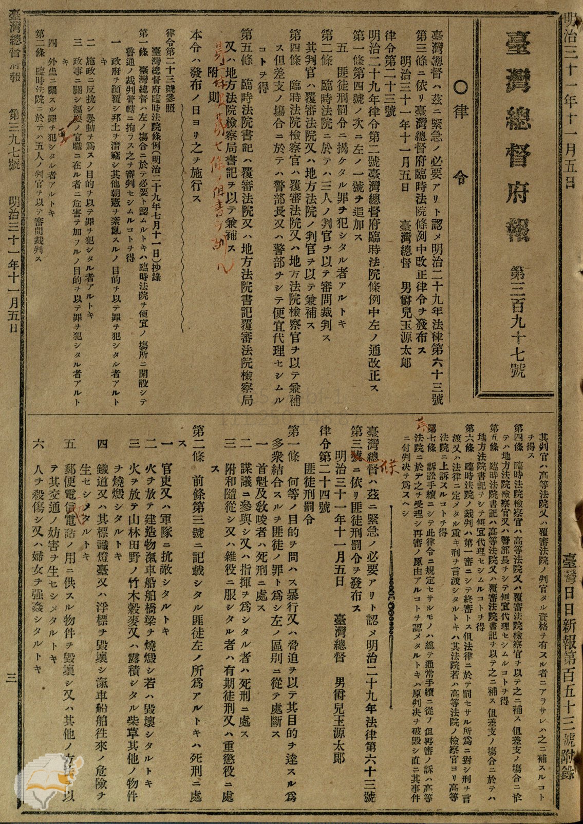 對於亟欲建立威信的殖民政府而言,這些附著在帝國新領土上的「土匪」,無疑是要透過現代統治技術徹底清除的。1898 年,第四任總督兒玉源太郎與民政長官後藤新平的主導下,專門用來反制「匪徒」們的《匪徒刑罰令》正式公布。該法令第一條便宣告: