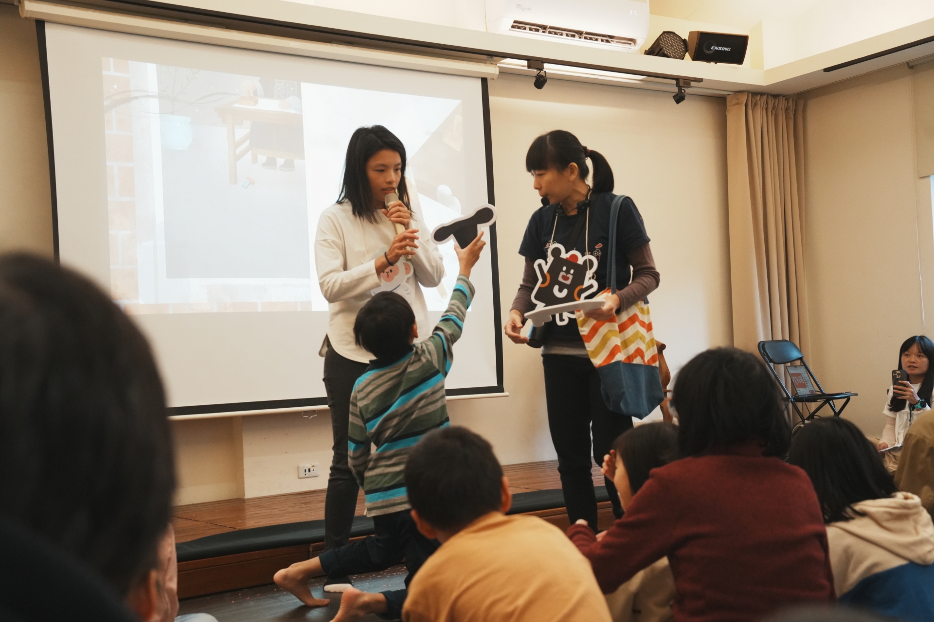 臺灣史不該只是課本裡由年代數字和史實名詞堆砌起的安靜文章,接觸起來可以更趣味也更體感。《島嶼ê時光織線》繪本在創作時已納入這樣的思考,現場活動更加強化肢體參與。在黑色布幕翻騰造起的時光隧道之中,孩子們跟著主角小黑啤與小白米,追著散落四處的機器人,走過了一段包括新石器時期、荷蘭統治、日治時期等多個重要時段在內的時光旅行。這些時代名稱對於現場的父母親來說耳熟能詳,對於年齡落在三歲到九歲之間的孩子來說則不見得熟悉——但這不妨礙孩子們興奮地舉起珠貝、官印、蒸汽火車等代表了各時代特性的物件,幫助小黑啤了解自己身處哪一個時空。在一次次尋找、互動、回答當中,即使不提年份與時代,孩子也已不知不覺熟悉概念,也無負擔地走進了歷史的大門。