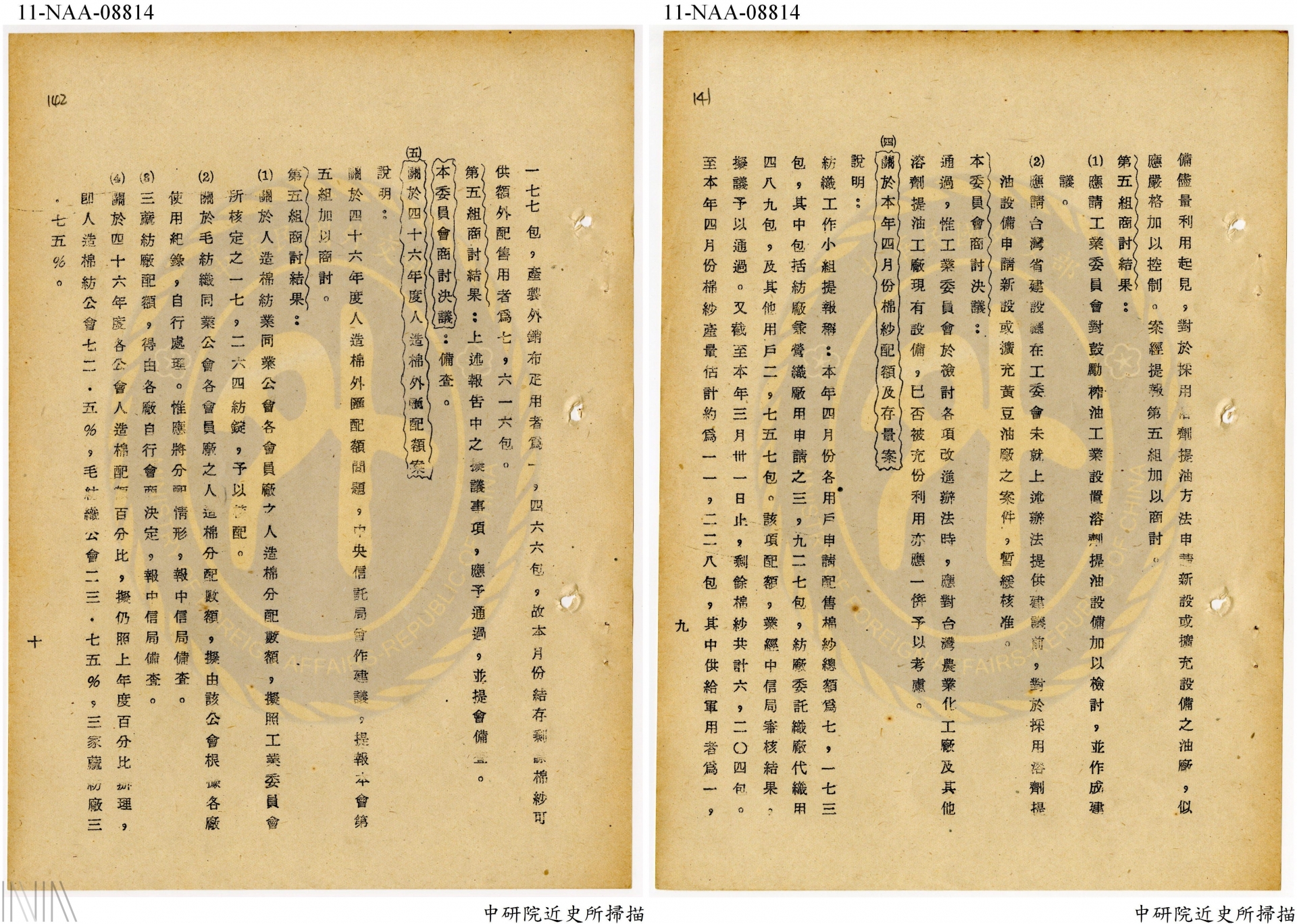 圖 1 在行政院安定委員會的會議節錄,提到紡織原料進口配額。檔號:A303000000B/0046/474.1/29