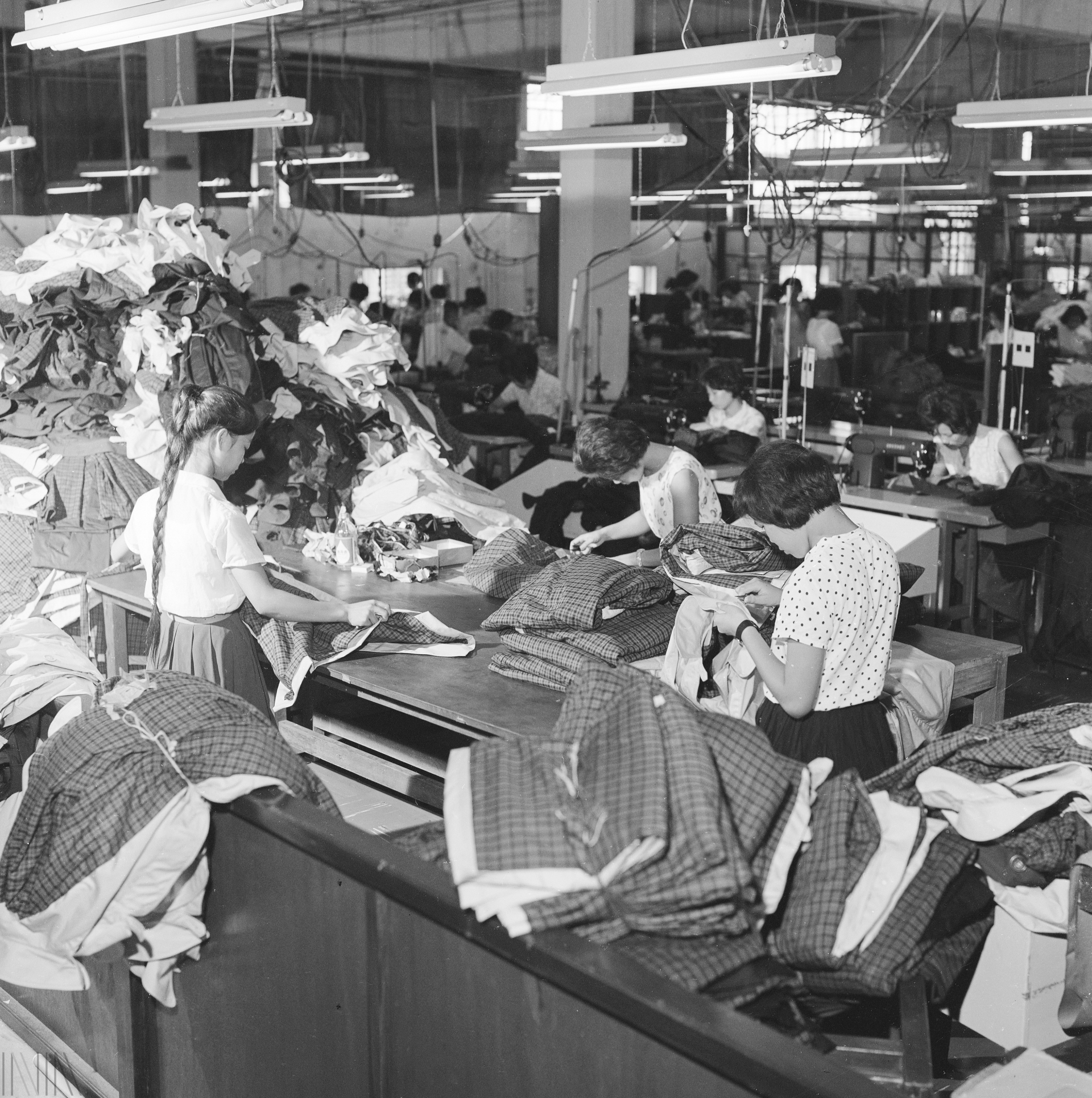 後來,政府又設立楠梓、臺中加工出口區,出口導向成形。這對傳統成衣工廠是個擴張機會,加工出口區透過租稅優惠、通關便利與設施集中優勢,使工廠降低進出口原料與成品運輸的時間成本,順利接軌國際買主採購與交貨節奏。園區的群聚效應,促成上下游廠商與代工網絡的形成,使剪裁、車縫、整燙、包裝得以在加工出口區內有效率整合。漸漸地,臺灣紡織業從傳統作坊式經營,轉向以外銷訂單為導向的量產體系。