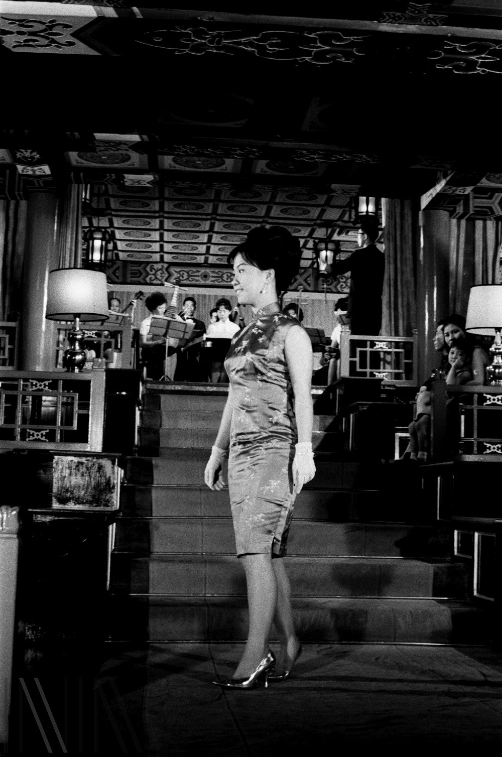 圖 8 自動化機器可以製作品質均勻的紗錠,衍生出來的紡紗織物則可以運用在旗袍的製作上,圖中穿著旗袍的中國小姐在進行時裝表演展示。檔號:A325000000E/0059/0045/1