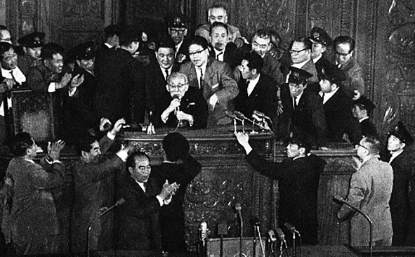 1960 年,在前甲級戰犯嫌疑人岸信介內閣總理大臣的強權政治下,反對《日美安保條約》的全國性運動受到鎮壓,新的《日美安保條約》自動成立。隨後,岸信介辭職,反安保國民運動迅速退潮。