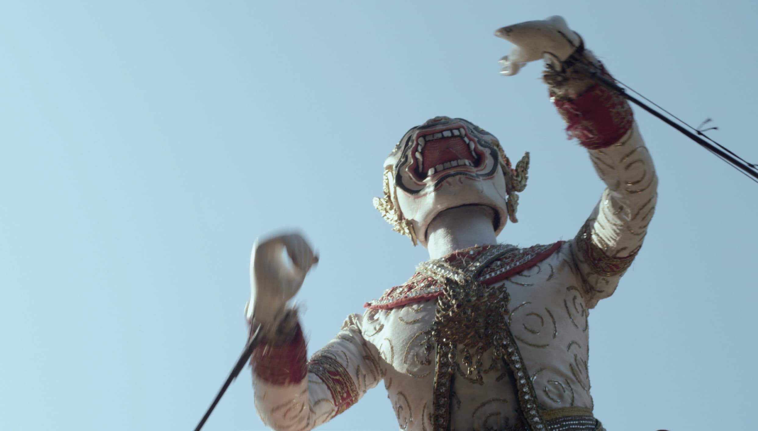 片末最後一幕,旁白講述者已然離去,徒留影片還在錄音室中持續播放著。數十年過去以後,原本積怨、不可見的幽靈都已然離開這個世界;恐怕下場如同影片一開始的第一句台詞:「這個故事再也沒有人講了」。老兵們曾經作為守護恩庇者的哈努曼,今天卻也在等待另個哈努曼將他們保送回屬於自己的國。最後,卻只能遙望台上那終究是一場虛構的戲劇,抑或從來只是不屬於凡間的神話。