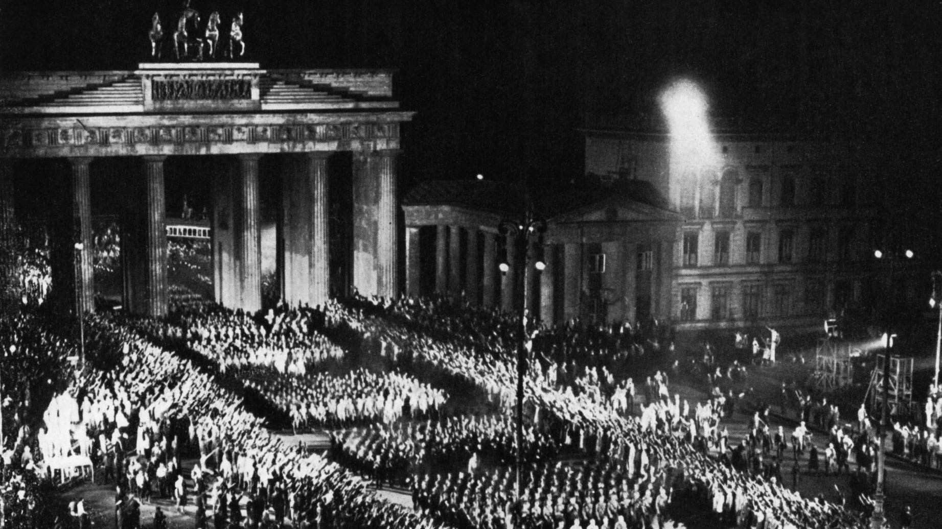 希特勒從三千公尺的夜空向柏林急轉而下,天上飄然之音變為巨大爆裂的聲響,巨大的火光緩緩降落在會場不遠的廣場上。場內 12 萬和擠在場外的 8 萬群眾都一同起立,將右手向前身出,高呼著:「萬歲!希特勒!」