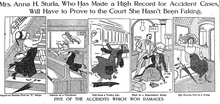不過後來,終於有人發現事情不太對勁──因為安娜不管在什麼地方跌倒,總會向那個場所的負責單位求取賠償,據說四年下來,她已經從這類事故裡面,獲得了將近三千元的撫慰金(放在今天來看,這筆錢的購買力,相當於兩萬七千美元左右)。換句話說,安娜很可能是個故意製造「香蕉皮事故」來賺錢的騙子。