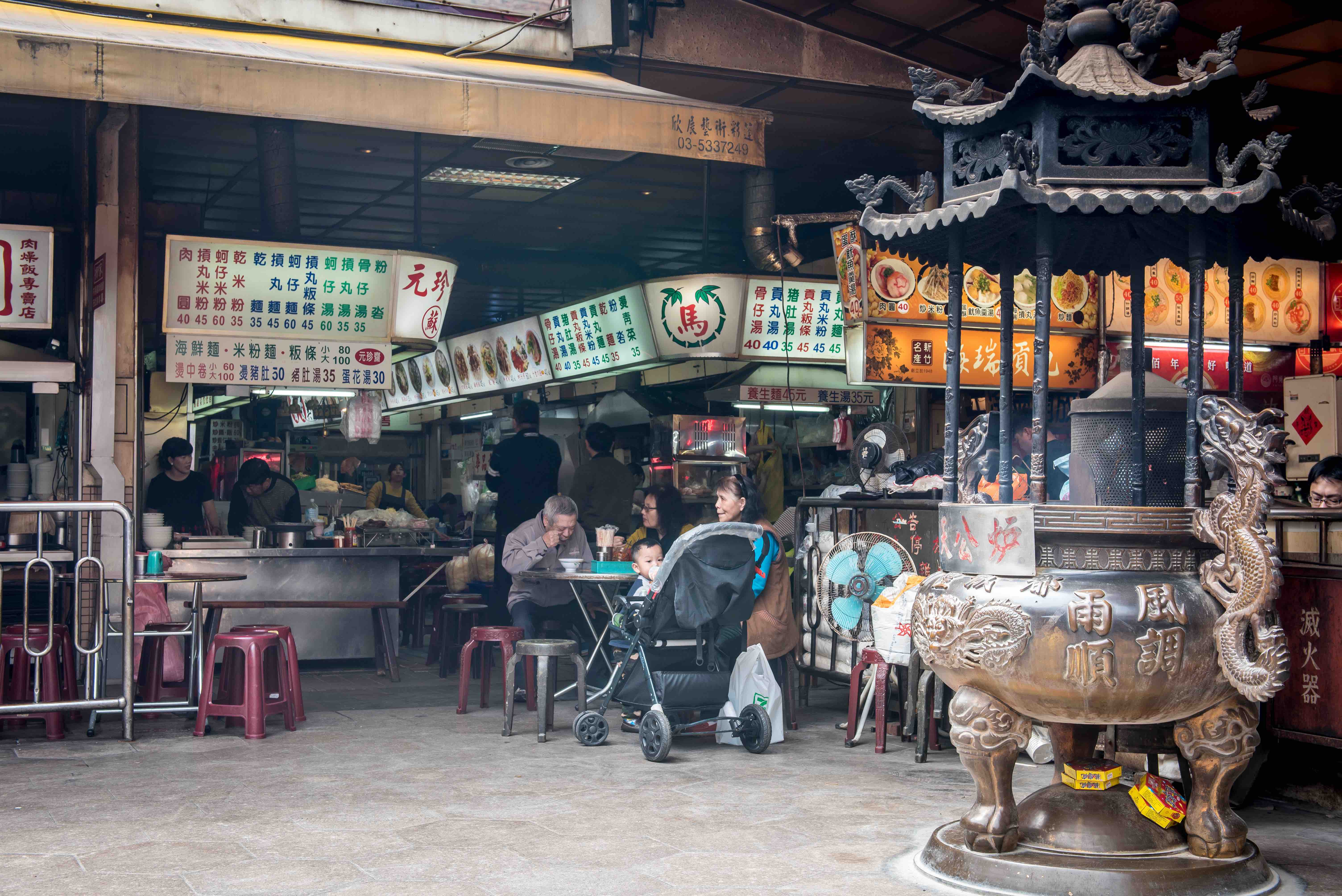 再仔細瞧瞧,從水溝、地磚到鐵製天花板,無一不是廟方特別設置的「公共設施」。參拜人潮與大啖美食的饕客來回穿梭,飲食與信仰在擁擠的廟口,呈現奇妙的共生關係。