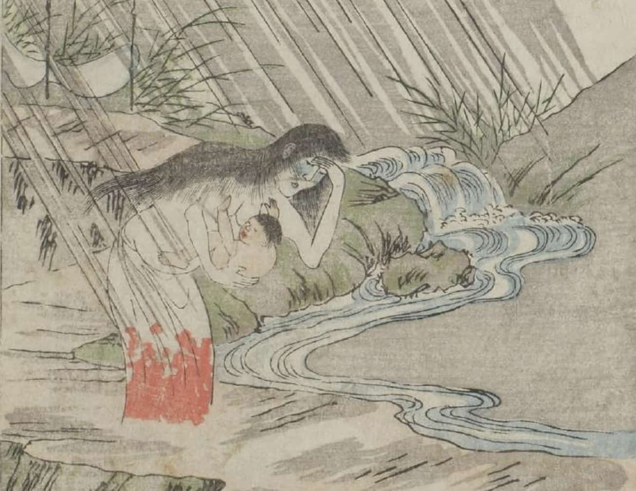 何以,產女會以女子抱著小孩的形象出現呢?根據喜多村筠庭所著的〈嘻笑遊覽〉中顯示:產女是由死亡的產婦所轉變而成的怨靈,胸前坦露著一對乳房,喜歡帶走別人的小孩,當成自己的小孩來養。