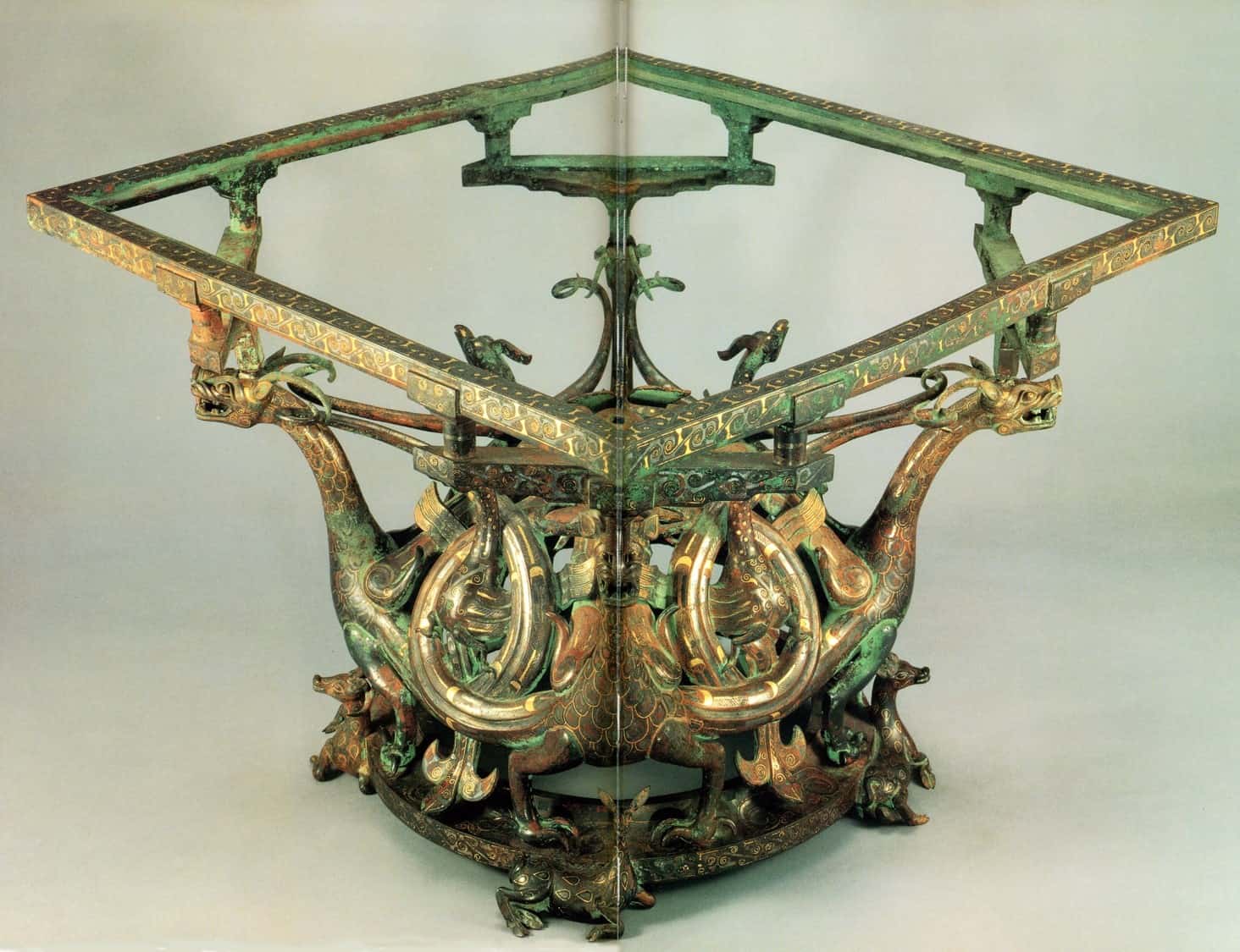 如果我們走進中山國國王位於靈壽城(今河北)的宮殿,首先映入眼簾的大概就是它,一張由四頭鹿托著的環形底座小桌子,環形底座上站著四頭有翅膀的神獸。這四頭有翼神獸的翅膀向外延伸,先與鄰近的翅膀交疊,環繞著一隻鳳鳥,尖端再與自己的角勾連,頭上則有如同建築斗拱般結構支撐著放置桌板的方框。