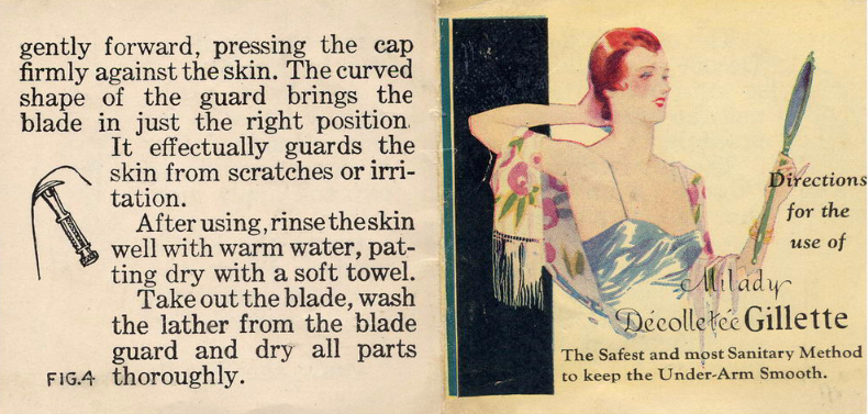 這則廣告銷售的是一款名為「麥勒蒂低胸裝」(Milady Décolleté,取自諧音 My-lady-Décolleté)的女性刮鬍刀。故名思義,這款刮鬍刀一開始主打的就是會穿到低胸無袖晚禮服的上流社會女性。 如同二十年前吉列公司引起的男性刮鬍刀革命,這款女性刮鬍刀一樣是由黃銅製把手、可替換式刀片兩大件組合而成。