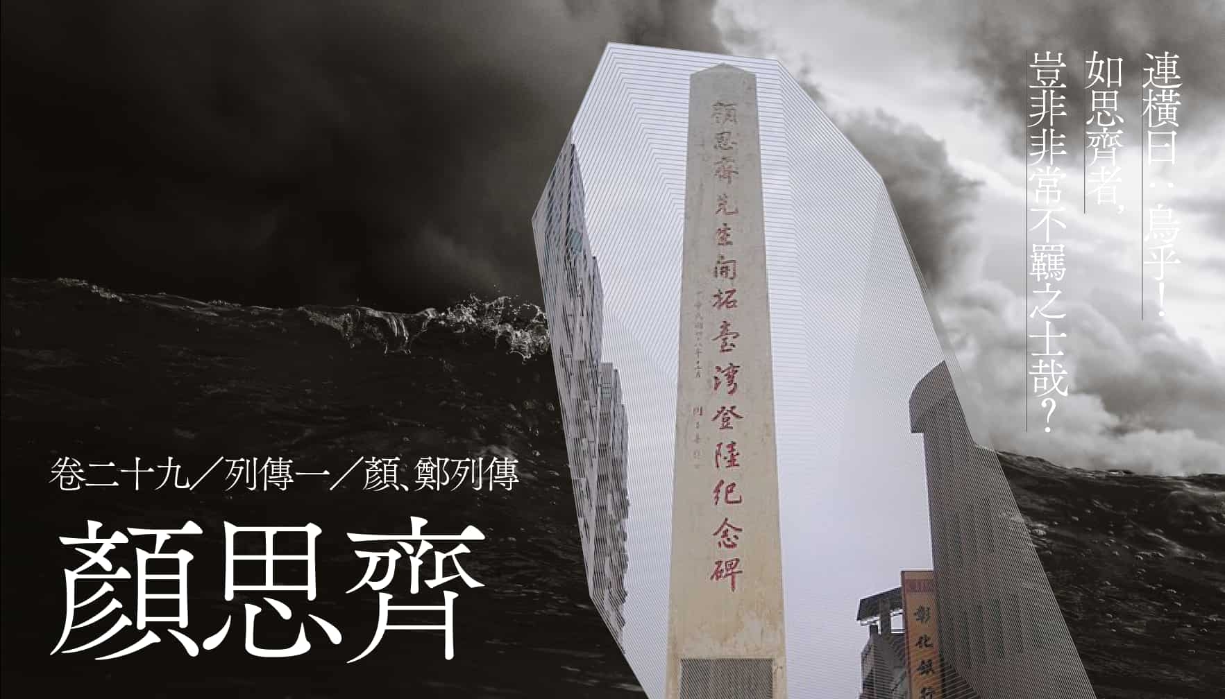 翻開《臺灣通史》,此為作者連橫在書中列傳的開卷語,從中可以看出連橫對於他心目中手拓臺灣的壯士——「顏思齊」的高度評價,並對他的事蹟遭到後人淡忘而感慨不已,是以將其放在列傳之首,地位甚至是在鄭成功的爸爸「鄭芝龍」之上,在今日雲林北港也可以見到為紀念顏思齊登陸的「顏思齊先生開拓臺灣登陸紀念碑」。