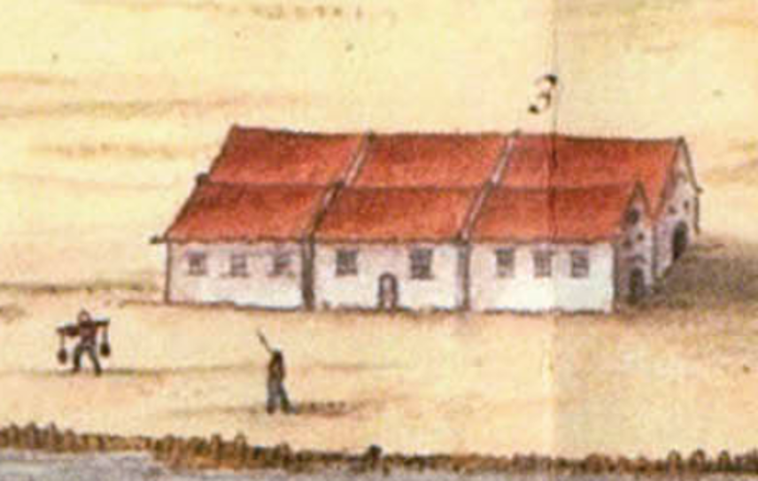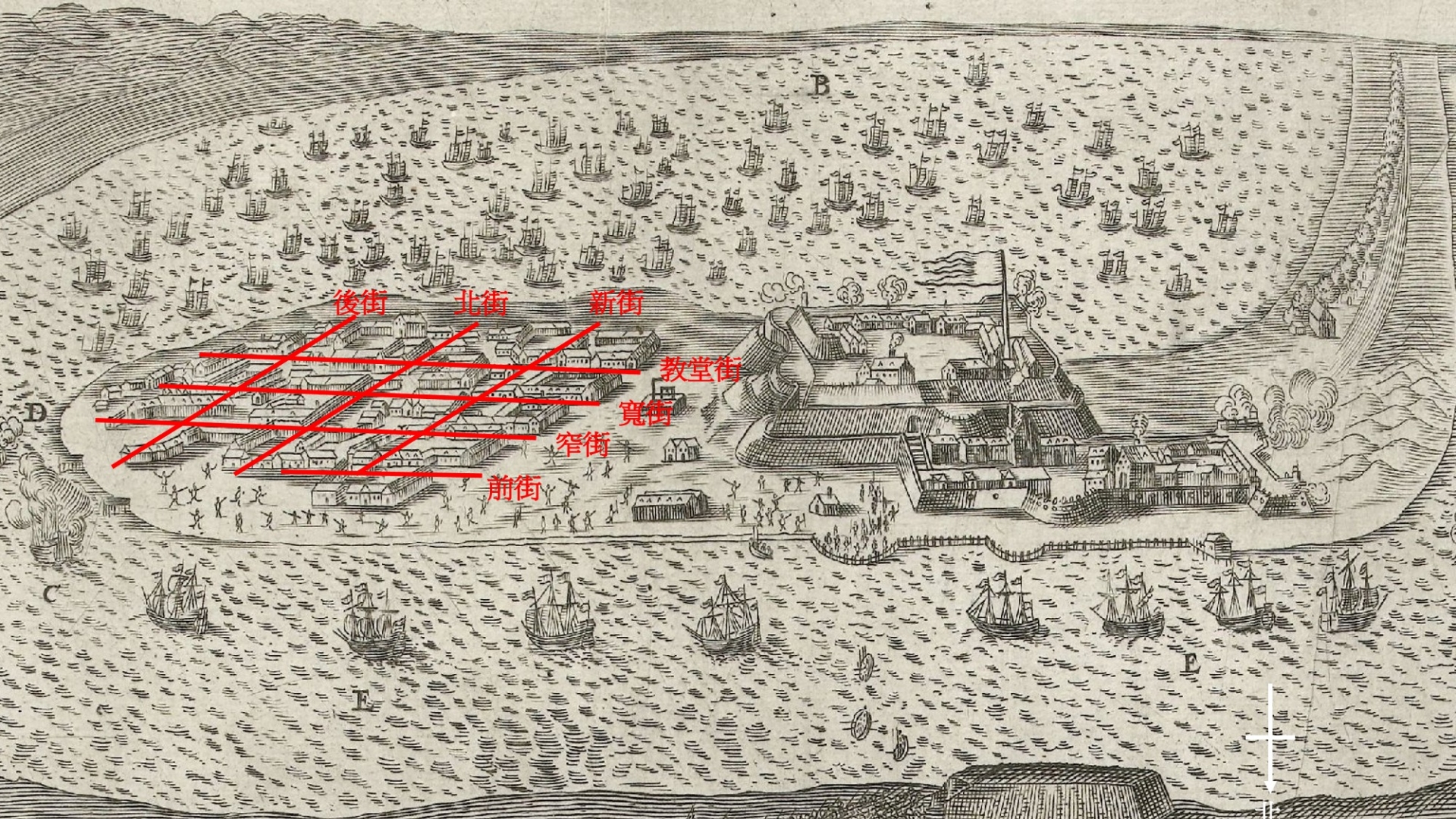 像是 1634 年,當時熱蘭遮堡的上層主堡建造完成,而其他部分陸續建設中,那年的 4 月 27 日《熱蘭遮城日誌》就記錄,臺灣長官普特曼斯與議會決議,為了避免城堡周圍人蛇雜處,又要方便荷蘭東印度公司的士兵與唐人滿足生活需求,因此在附近建造幾間小房舍,讓唐人與原住民帶著貨物來此出售。
