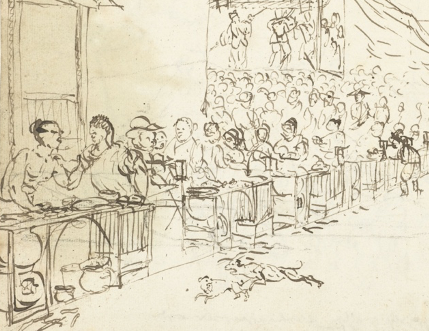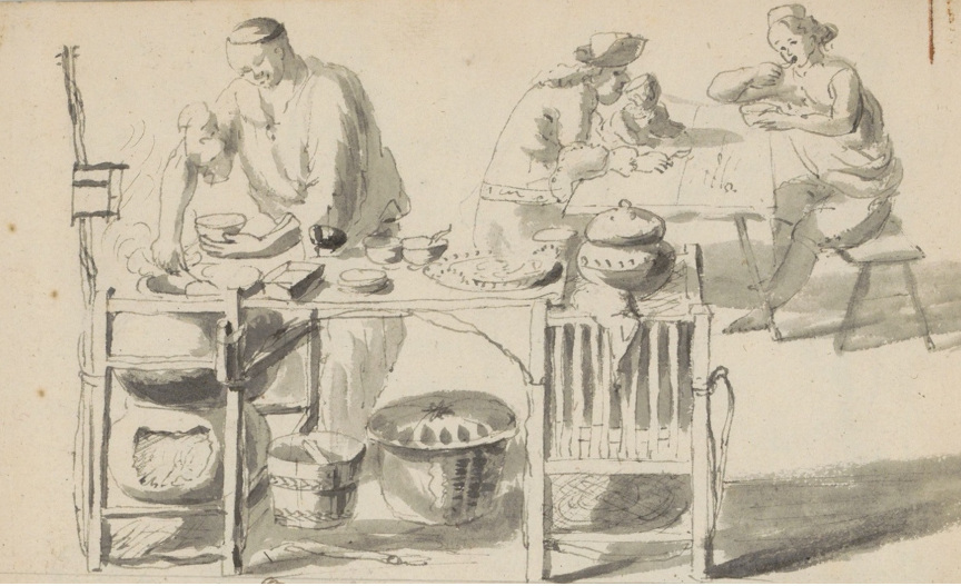 在上文提到沃特·舒頓的素描《市集》中,可以看到一整排賣著熟食的攤販,光顧的顧客人山人海。另外,在他描繪巴達維亞的各式百工生態的素描中,也包括一張攤販與食客的記錄,除了攤位更為清楚之外,可以發現食客也是有不同人種。