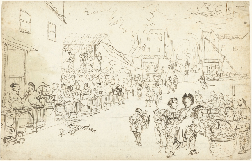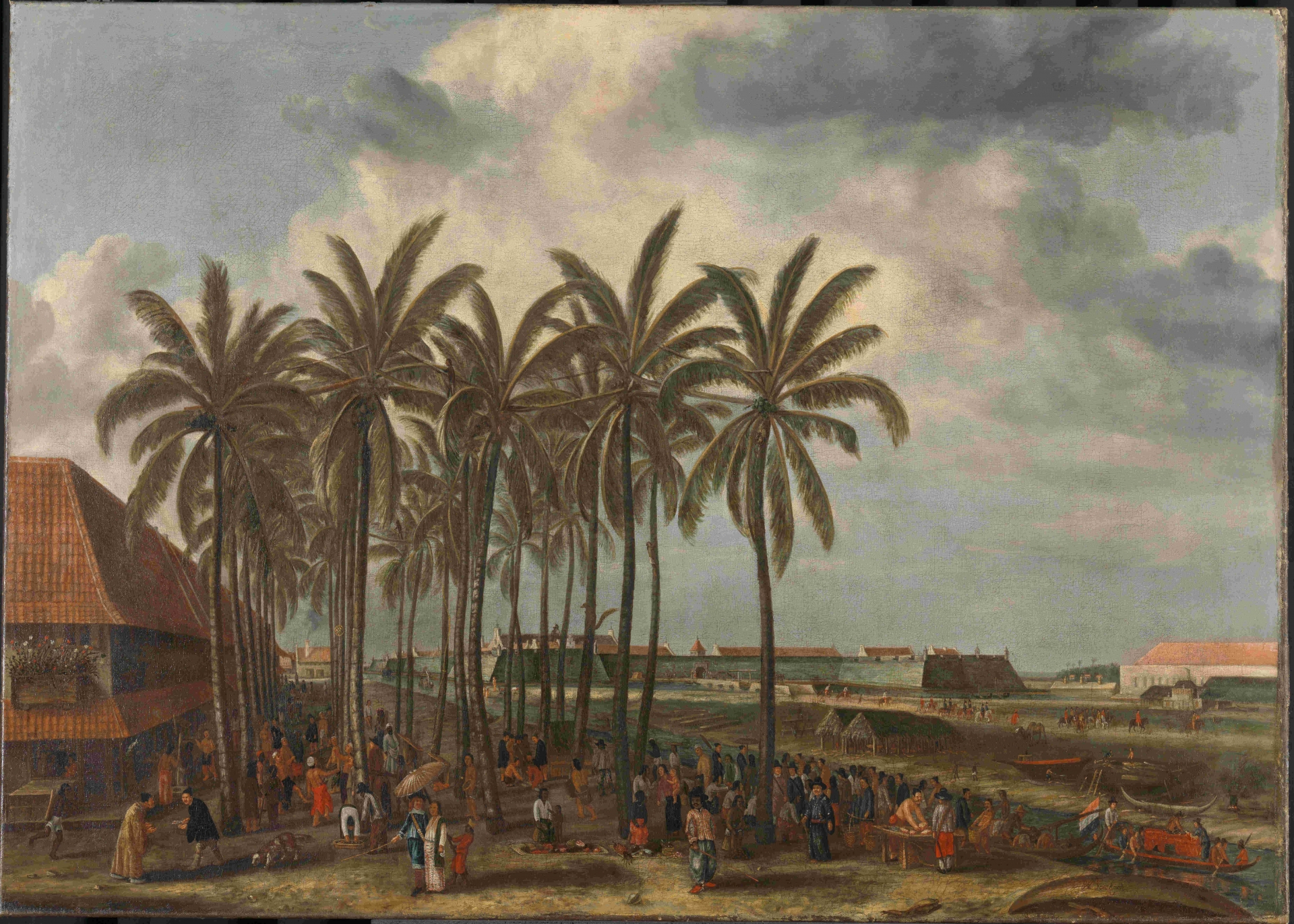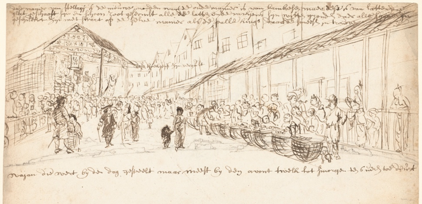 沃特·舒頓(Wouter Schouten),一位 1658 年進入荷蘭東印度公司,並且在船隻上兼任理髮師的外科醫生,在同一年到達巴達維亞(Batavia,即今日印尼雅加達),待了將近一年,又隨船隻派駐到其他地方。而他留下許多素描作品中,呈現了巴達維亞的實景,就像這幅《市集》(Markttafereel)中,呈現巴達維亞市集的模樣,近景有著歐洲人逛著一邊生食區販賣的漁獲、蔬菜等,另一側則是由唐人老闆經營的熟食,光顧的客人幾乎把路邊的位置坐滿;遠景除了歐洲風格的房舍外,那臺下人山人海的觀眾,正在欣賞著舞臺上的戲曲。