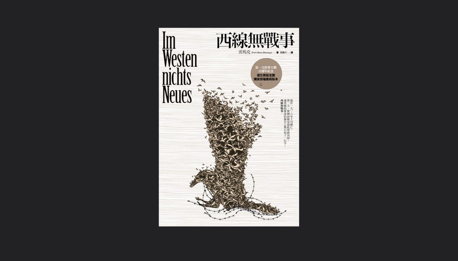 被喻為法國版的《西線無戰事》:《恐懼》一書已經在上一篇文章介紹過了,這次要介紹《西線無戰事》這本經典反戰文本,與其是介紹這本家喻戶曉的文學讀本,不如坦白地向讀者承認本文的產生動機吧。筆者在探索此次「戰爭人生」的主題中,為了達到選書的平衡,企圖巡禮戰爭雙方的文學觀點,挑起戰事的協約國一方是否罪不可赦?為捍衛家鄉的同盟國只有應戰此一選擇嗎?這些疑問在閱讀小說過程中慢慢的增強。