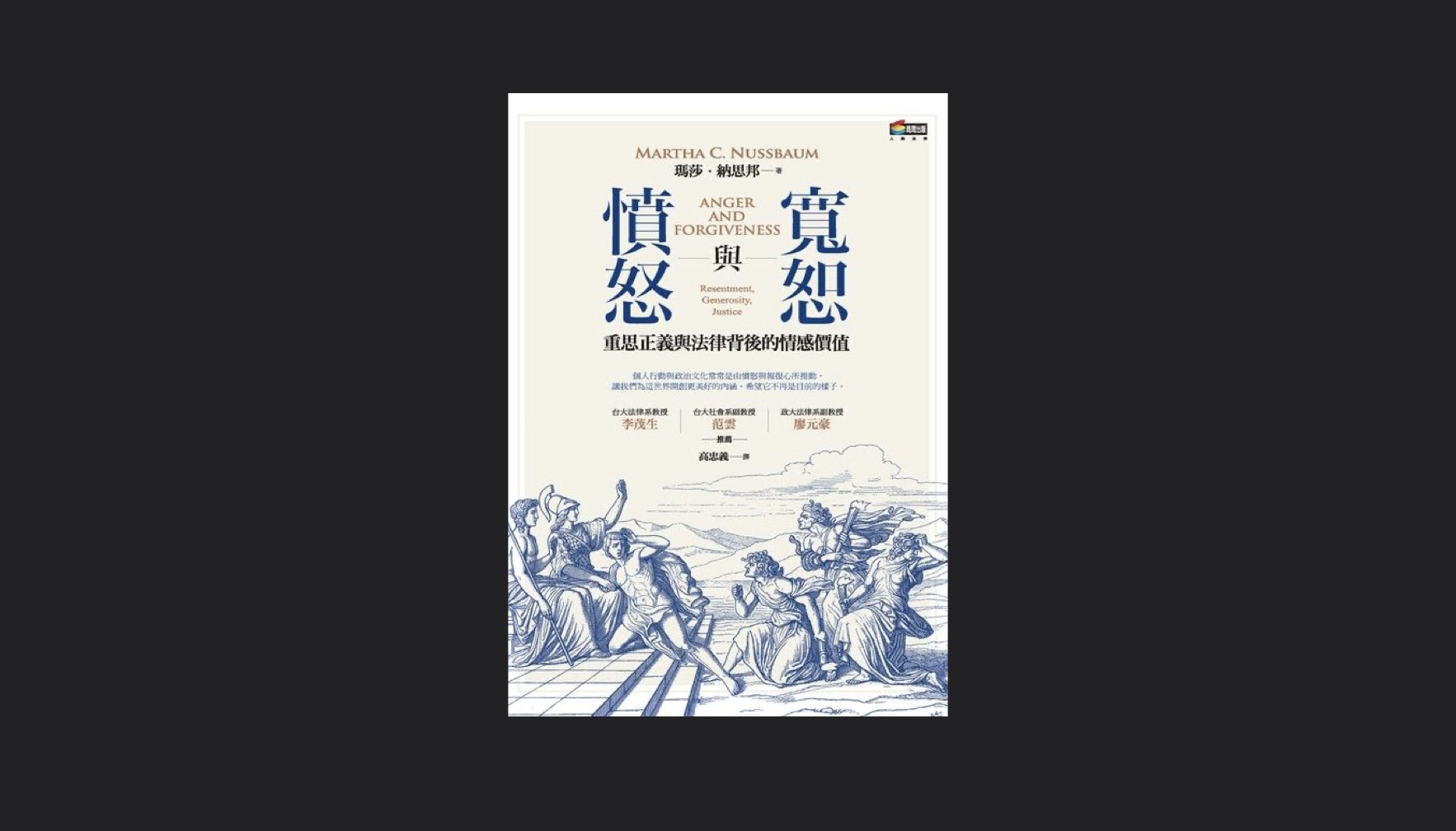 而本書既可視為納思邦延續其在《善的脆弱性:古希臘悲劇和哲學中的運氣與倫理》的關注,對「情感」價值的進一步探討,也可當作是在《逃避人性︰噁心、羞恥與法律》爬梳人們的噁心、羞恥等情感在法律制度中所扮演的角色、對其造成的影響後,轉向關注「憤怒」、「寬恕」這兩種「情感」的歷史及當代脈絡。
