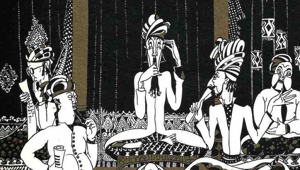 這首詩非常有名,也是被最多插畫家畫過的一首 (據統計到目前為止已有 56 位)。今天介紹的這幅,是艾德蒙・杜拉克 (Edmund Dulac,1882-1953) 畫的。這位畫家原籍法國,後歸化英國並定居倫敦。他的畫風細膩,人物姿態生動自然,當年的名氣可跟之前介紹過的亞瑟・瑞肯(Arthur Rackham) 分庭抗禮。他畫的這本魯拜集自 1909 年首版問世以來,至今也不知再版了幾次,極受大眾歡迎。