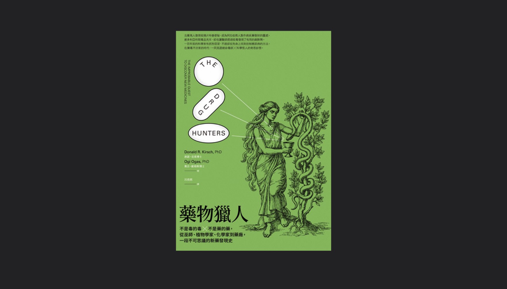 本書作者唐諾・克希(Donald R. Kirsch)曾在惠氏、氰胺、施貴寶和坎布利亞等藥廠擔任主任、研究團隊領導者與首席科學家,目前在哈佛終身教育學院教授藥物搜尋課程。作者不但博學,他那近四十年的藥物研發經歷,更讓讀者一窺製藥產業的秘辛。再加上奧吉・歐格斯(Ogi Ogas)這位專職科普作家,讓本書既容易閱讀又不失專業。