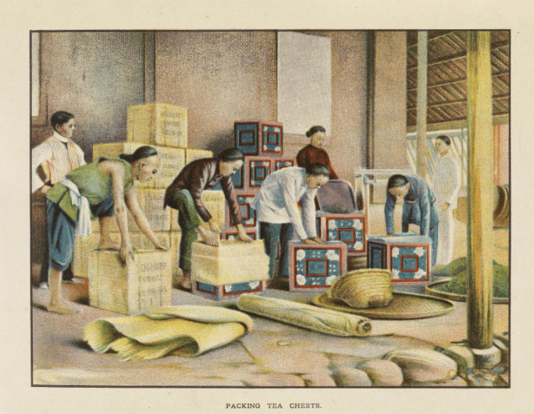 清末茶行打包茶箱、黏貼茶箱標籤的場景。圖像出自臺灣總督府殖產局《臺灣烏龍茶》(Formosa Oolong Tea)(Source:國立臺灣博物館)
