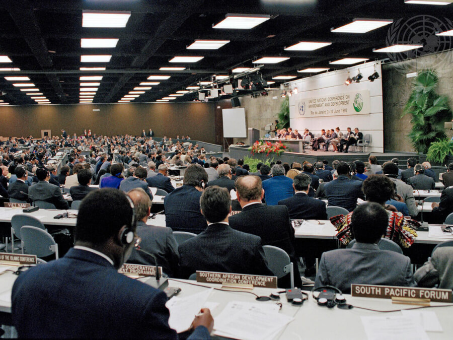 在 20 年後的里約熱內盧,聯合國第一次正式討論「永續發展」概念,連同參與的 178 個國家代表,簽訂了《21 世紀議程》(Agenda 21),將「永續發展三要素——經濟、環境、社會」具體化。只可惜面對這份不具強制力的議程,人類仍有努力空間。(圖片來源:UN Photo)